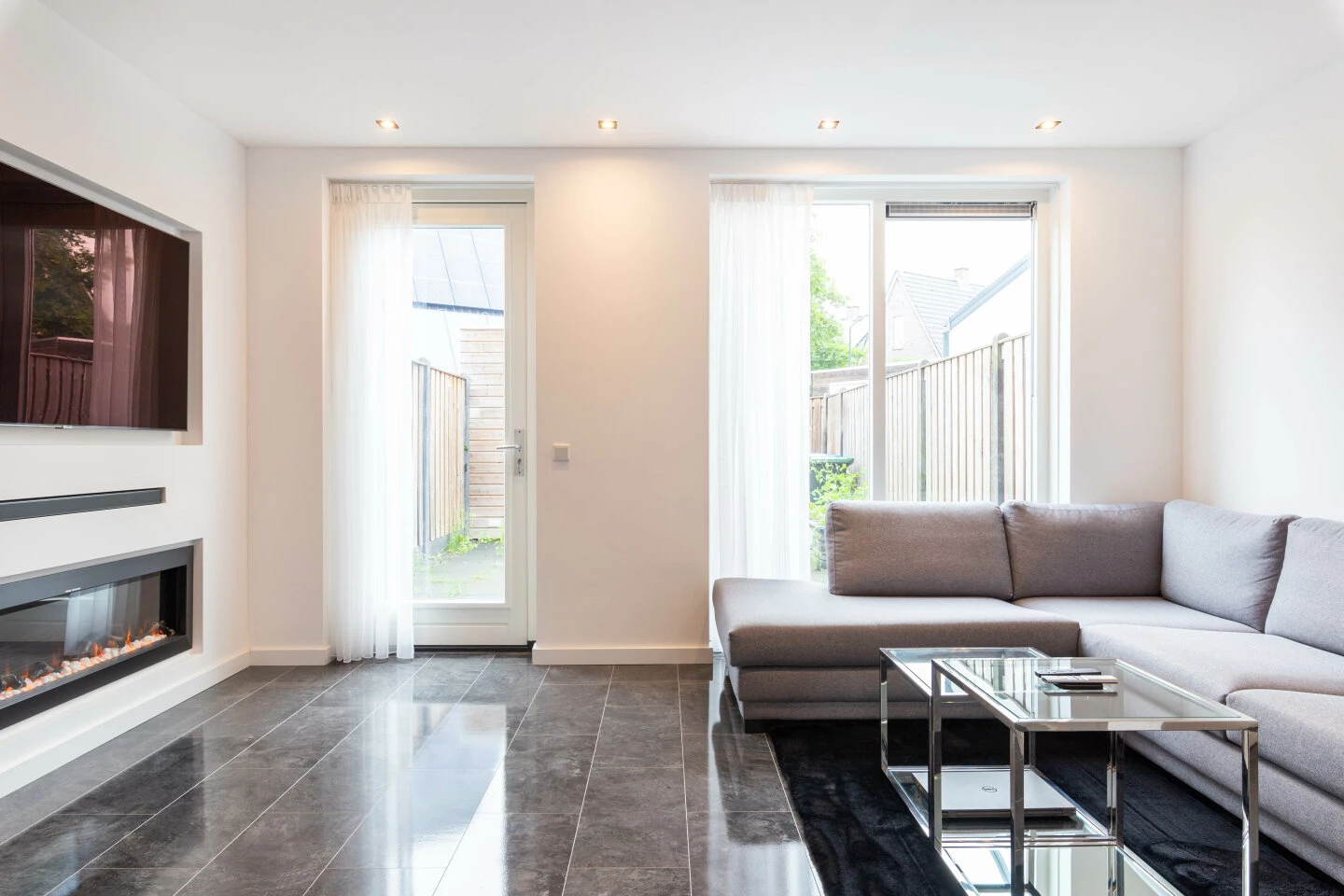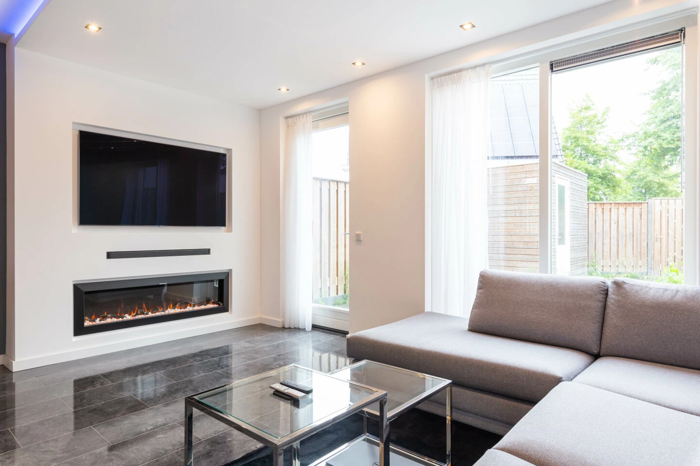Entree, ruime hal, toilet, meterkast, trapopgang naar 1ste verdieping en deur naar keuken en woonkamer. De keuken is aan de voorzijde gelegen, Modern en luxe uitgevoerd met een hoekje waar je gezellig aan kan schuiven. Verder is de keuken onder meer voorzien van magnetron, oven, koelkast, vaatwasser, afzuigkap en een kookplaat. De tuingerichte woonkamer is heerlijk ruim opgezet en is voorzien van vloerverwarming. De TV en openhaard zijn ingebouwd tevens is de woonkamer voorzien van inbouwspotjes en led verlichting. Vanuit de woonkamer heeft u direct toegang via de schuifpui en loopdeur tot de rustig gelegen tuin. Deze tuin is ook benaderbaar via de achterkant van de woning. Achterin staat een houten berging, voor opslag e.d.