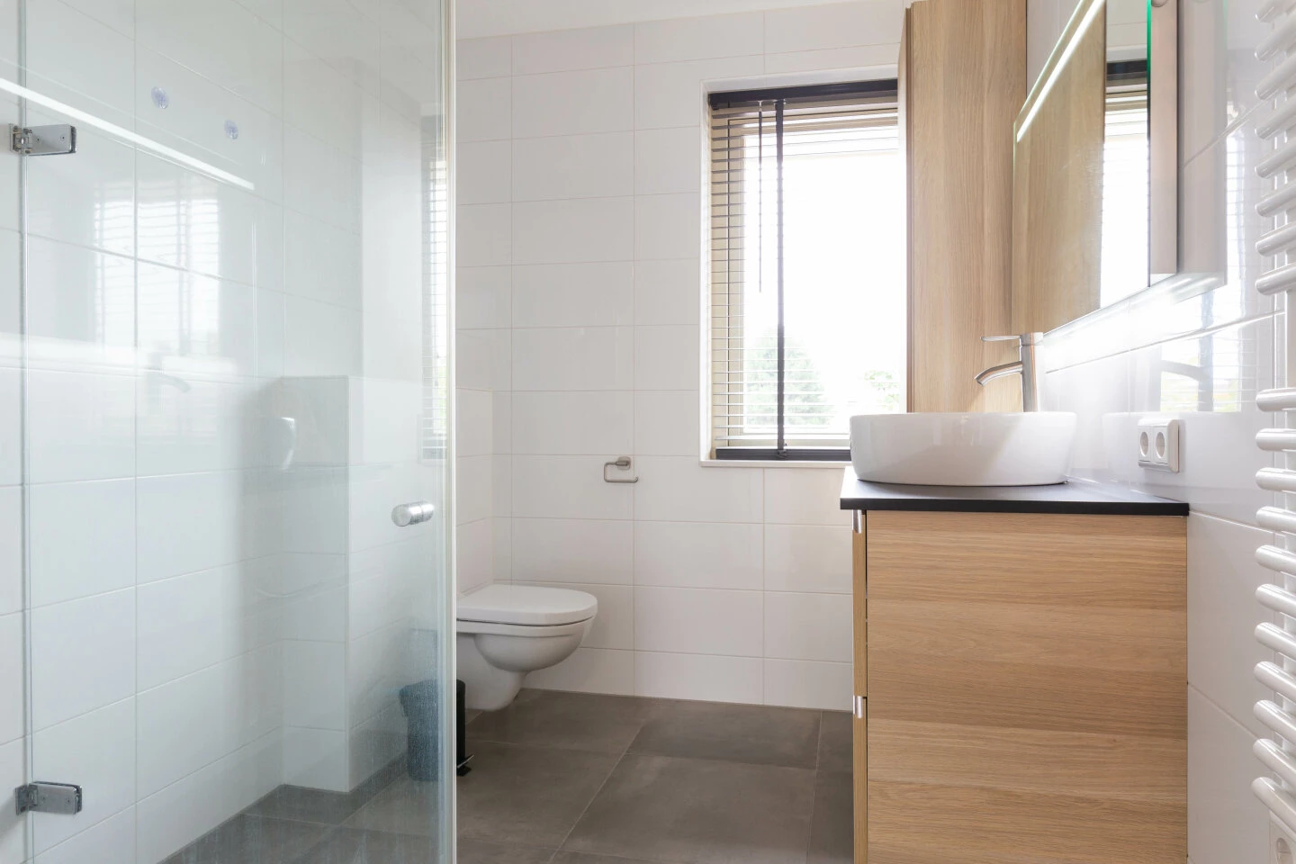 Hier zijn drie slaapkamers en een badkamer voorzien van douche, toilet en wastafelmeubel. Ook deze verdieping is voorzien van vloerverwarming. De badkamer is in lichte kleuren uitgevoerd en een raam zorgt voor natuurlijk licht en ventilatie.