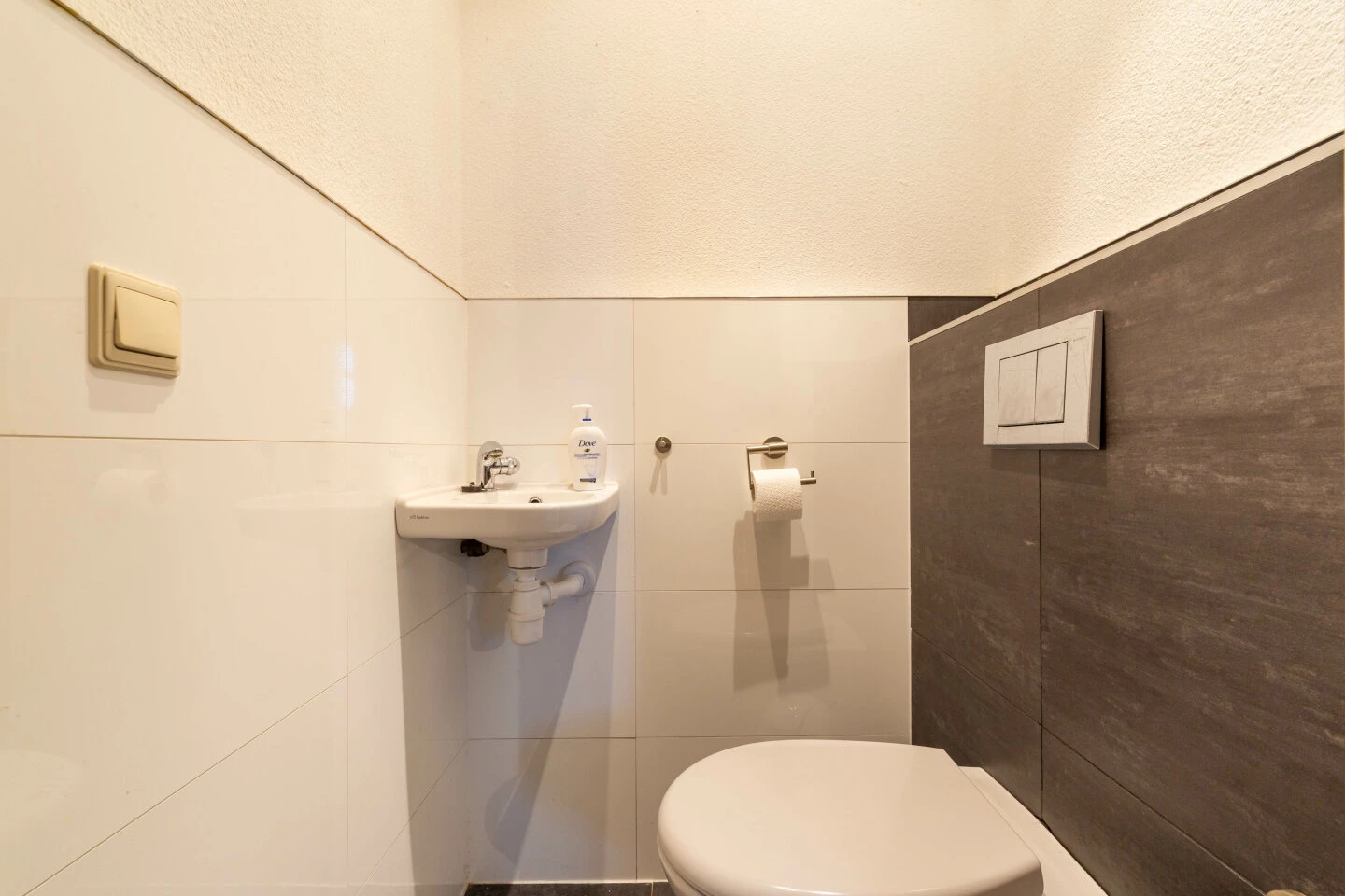 De badkamer is netjes en verzorgd. De vloer is voorzien van donkere tegels en de wanden van lichte tegels. Het hoekligbad met douche, hangend toilet, en groot wastafelmeubel maken de ruimte vervolgens compleet. Praktisch is het raam dat voor extra daglicht en ventilatie zorgt.