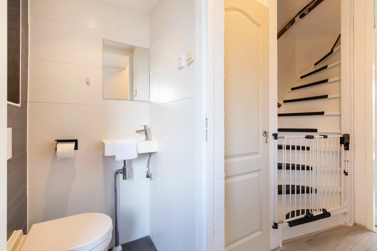 De badkamer is licht en voorzien van een hoekbad, douche, zwevend toilet, wastafelmeubel en designradiator maken de ruimte vervolgens compleet. Er is een raam dat voor extra daglicht en natuurlijke ventilatie zorgt.
