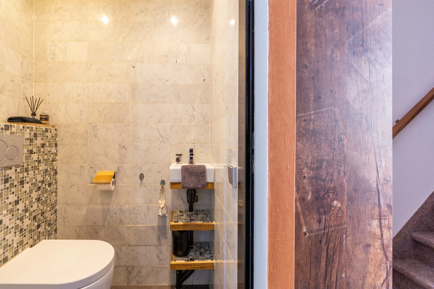 Je betreedt de woning via de hal. Hier is ook de betegelde toiletruimte met fonteintje (2020), meterkast en trapopgang. Aansluitend aan de woning is er een ruime berging. De woonkamer is voorzien van een houtenvloer en de hal is voorzien van een pvc vloer.