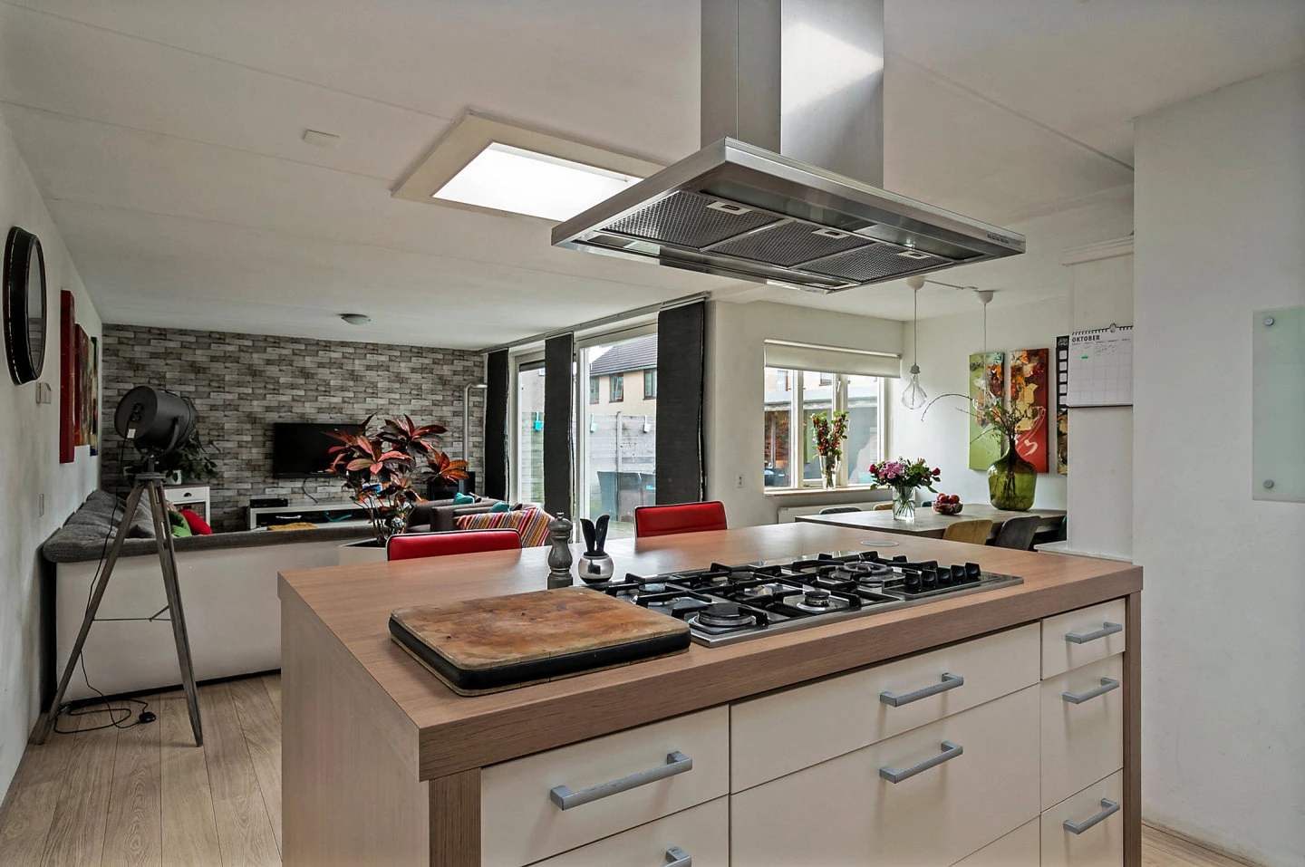 De ruime tuingerichte woonkamer is in L opstelling. In de hoek van de woonkamer staat keuken met een kookeiland. De keuken is voorzien van RVS afzuigschouw, 5 pits gas kookplaat, aanrechtblad met spoelbak, vaatwasser en magnetron en losse oven. Via de schuifpui toegang naar de tuin en een aparte berging.