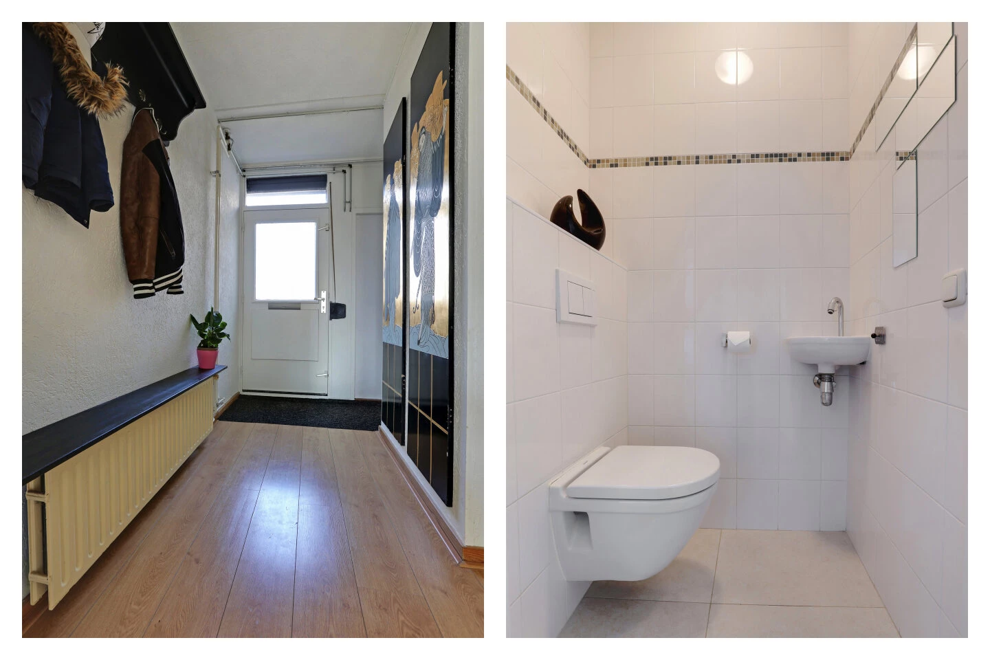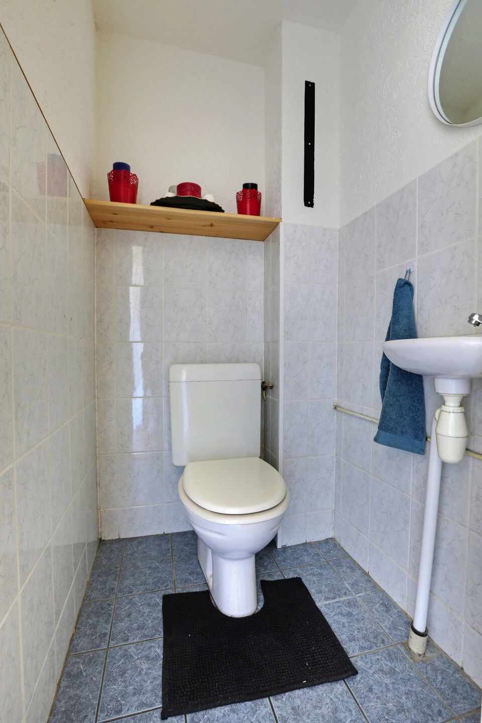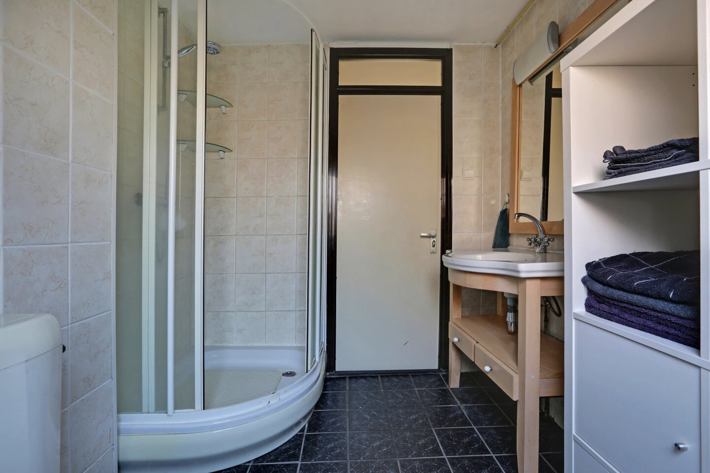 De badkamer is aan de voorzijde gelegen, deze is volledig betegelde en voorzien van een douchecabine, tweede toilet en wastafel. Praktisch is het dakraam dat voor extra daglicht en ventilatie zorgt.