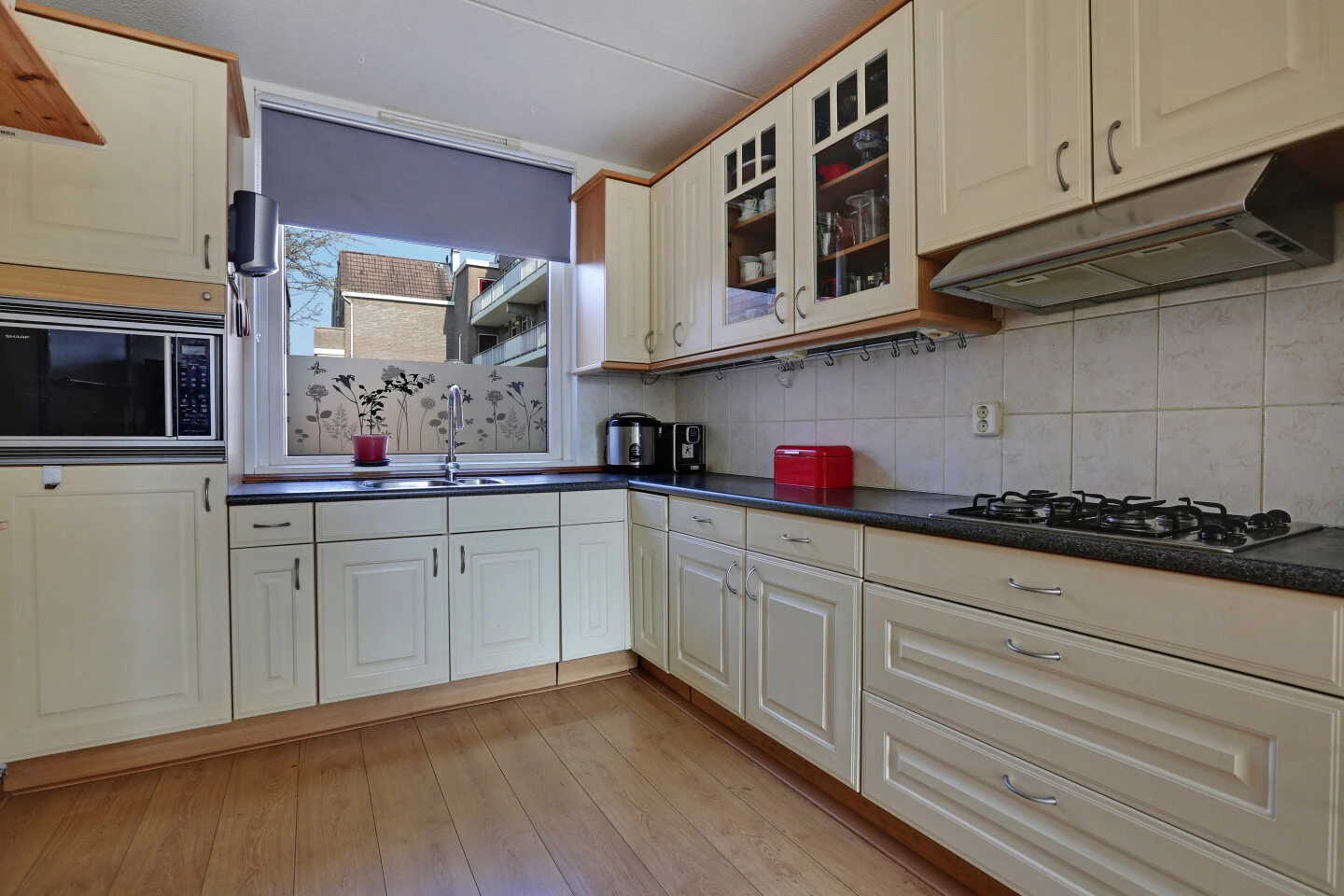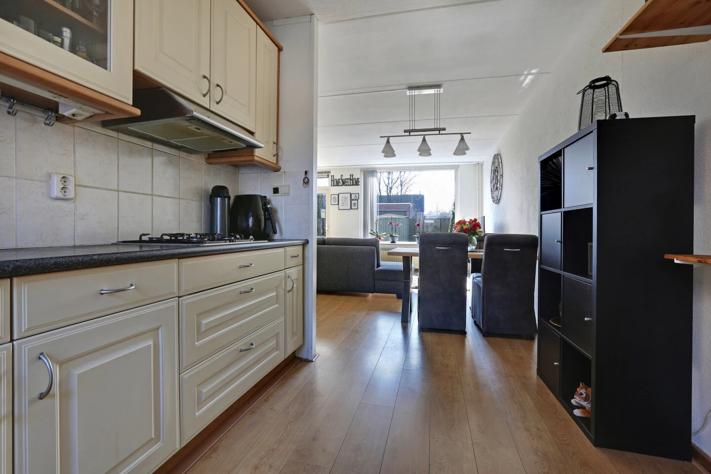 Aan de voorzijde bevindt zich de open keuken, deze is heerlijk ruim met veel werkruimte. De landelijke keuken heeft een L-opstelling en is licht van kleur. Deze keuken is voorzien van inbouwapparatuur zoals een gaskookplaat, oven, afzuigkap en losse koelkast (deze staat in de berging).
