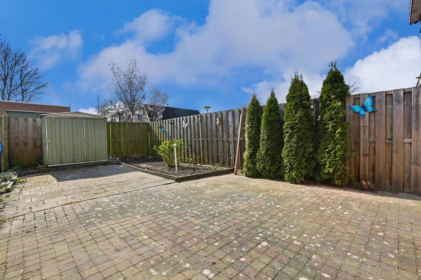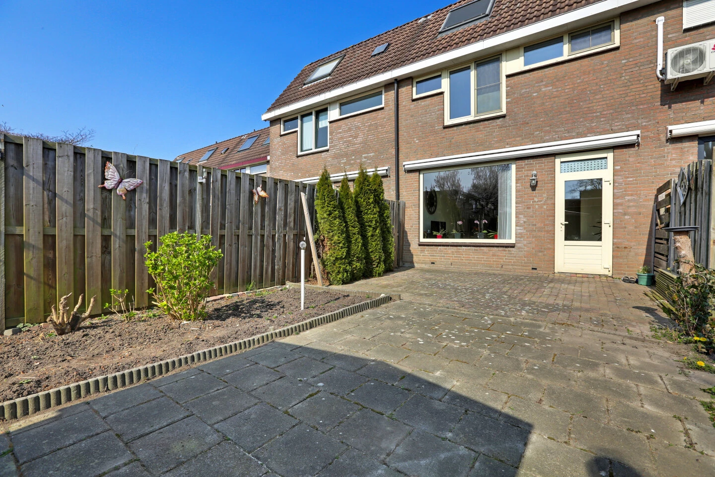 De tuin is gelegen op het zuiden en onderhoudsvrij aangelegd, voorzien van een heerlijke zit plek, omheind met schuttingen en borders met beplanting. Het elektrische zonnescherm zorgt er voor dat je ook op warme dagen heerlijk schaduwrijk kan zitten. Achter in de tuin staat een berging, handig voor het opbergen van tuinkussens e.d. De berging aan de voorzijde is ruim en geschikt voor het plaatsen van fietsen en voorzien van elektra. Aan de achterzijde van de woning is een speelveldje.