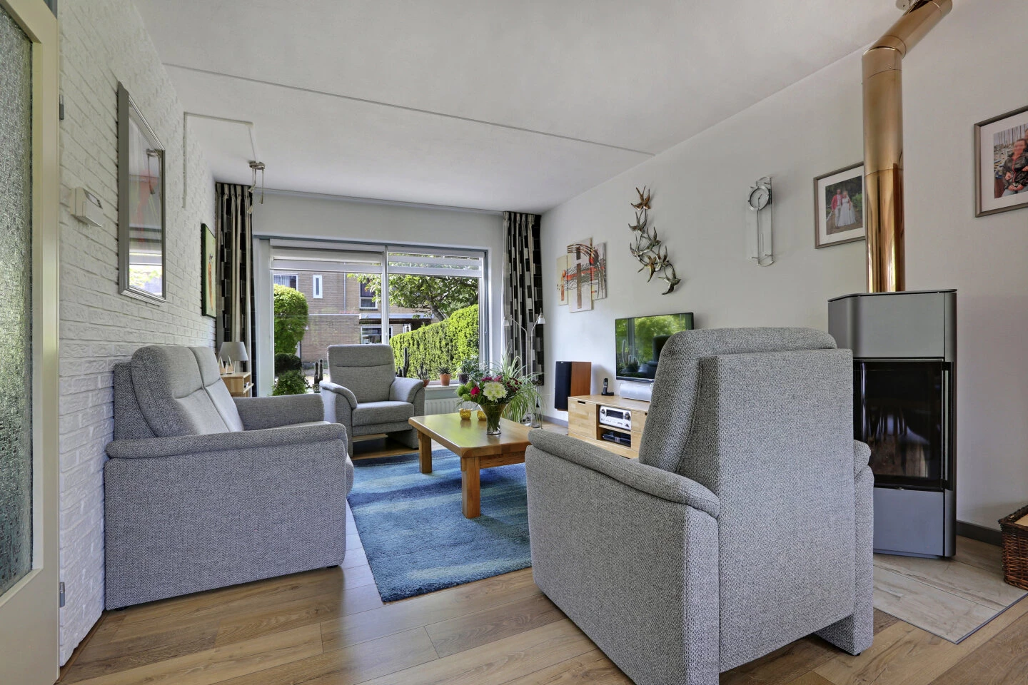 De woonkamer is aan de voorzijde gelegen, en is licht door de grote raampartij aan de keuken zijde is voldoende ruimte voor de eettafel. In de winter kun je heerlijk voor de kachel vertoeven met een goed glas wijn.