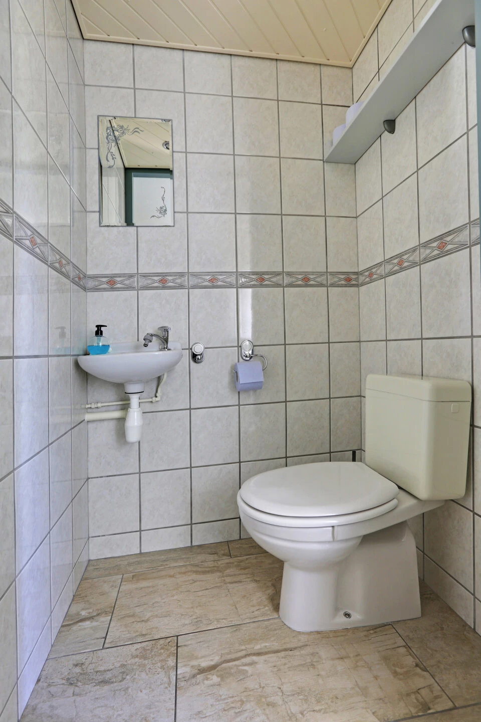 De badkamer is volledig betegeld. Het is een verzorgd en compleet geheel. De vloer en wanden zijn voorzien van lichte tegels. De douchecabine, zwevend toilet, wastafel en designradiator maken de ruimte vervolgens compleet. Praktisch is het smalle raam dat voor extra daglicht en ventilatie zorgt. Tevens is hier de wasmachine aansluiting.