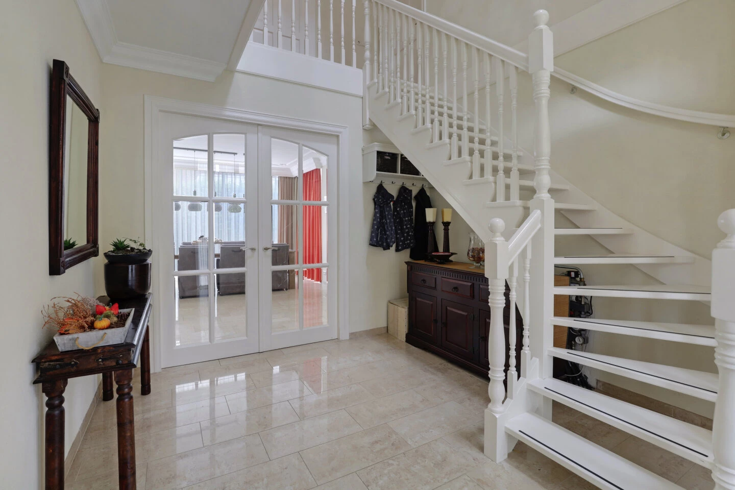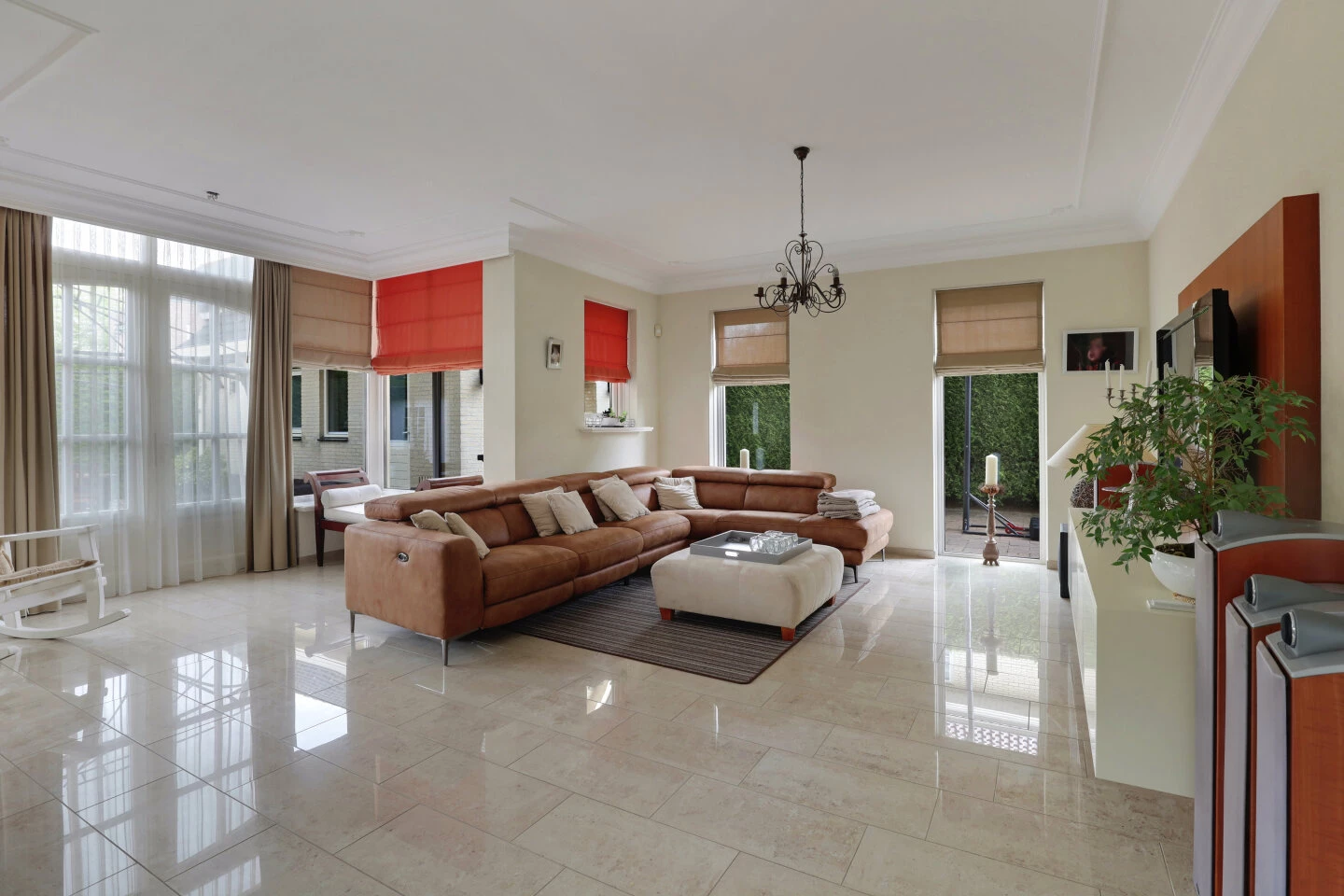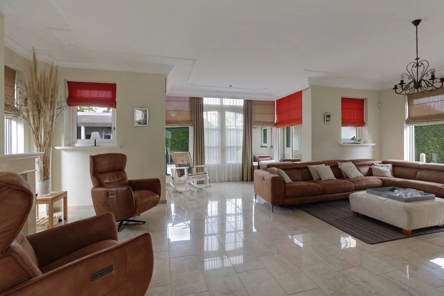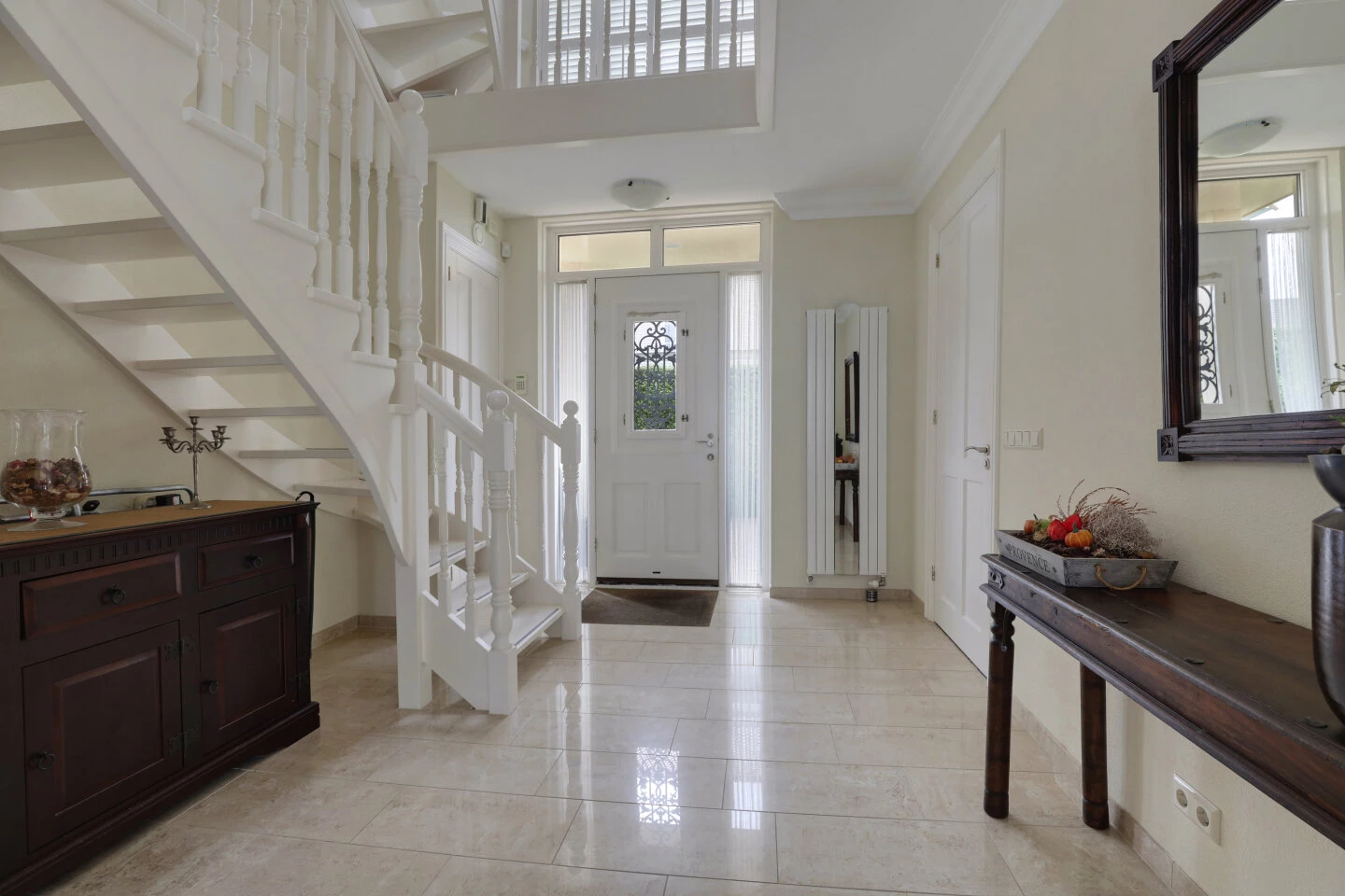Via de ruime eigen oprit met hek met elektrisch bedienbare poort kom je bij de woning. De ingang van de woning zit aan de zijkant. Je betreedt de woning via de royale hal met imposant trappenhuis met balustrade, door de kroonluchter wordt de hoogte van de woning hier prachtig benadrukt! In de hal is tevens de meterkast en het volledig betegelde toilet. Via de dubbele openslaande deuren kom je in de ruime woonkamer, dit gedeelte van de woonkamer is nu in gebruik als eetkamer, je kunt hier met gemak een grote eettafel kwijt. het gedeelte van de woonkamer aan de tuinzijde is door de vele raampartijen heel licht er is een zitgedeelte met open haard en een erker met openslaande deuren naar de achtertuin. De gehele begane grond is voorzien van een verlaagd plafond en afgewerkt met ornamenten en sierlijsten.