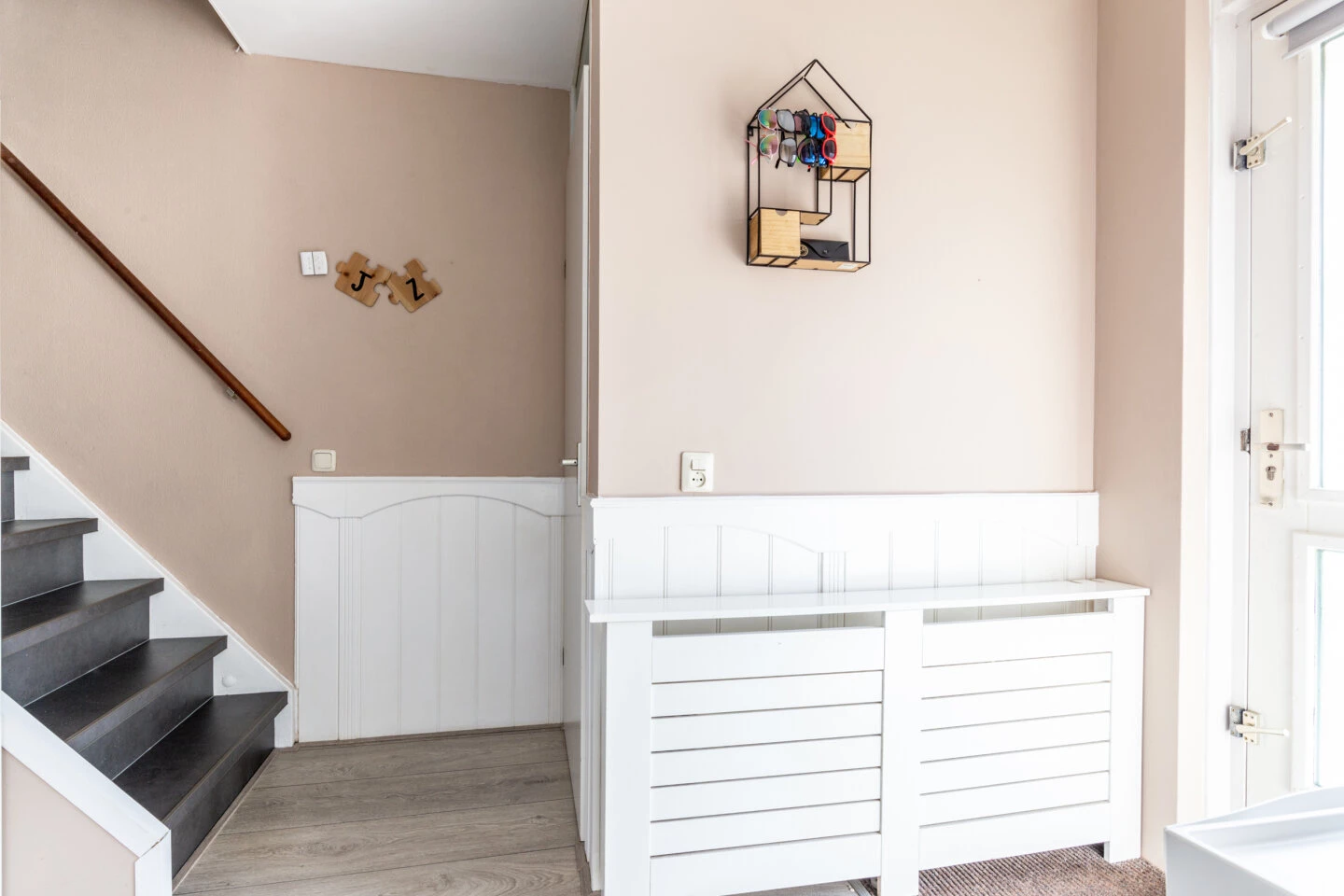 Je betreedt de woning via de ruime hal, hier vind je de meterkast, volledig betegelde toiletruimte (2022) met fonteintje, de trap naar de eerste verdieping en de woonkamer. Aan de achterzijde van de woning bevindt zich de woonkamer. Deze is sfeervol ingericht en voorzien van een laminaatvloer en lichte wanden. De woonkamer heeft heel veel licht door de grote raampartij en leuk uitzicht over de tuin. De tuin is bereikbaar via de loopdeur.