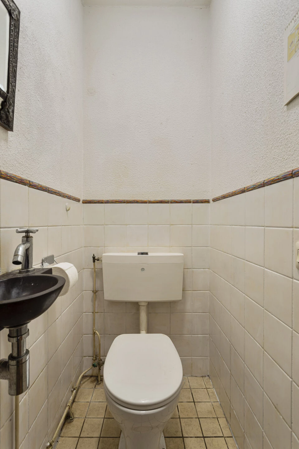 De badkamer is gelegen aan de voorzijde van de woning en heeft zwarte en witte betegeling. De open (stort)douche, whirlpool bad, toilet, kastruimte en wastafelmeubel en ruimte voor wasdroger maken de ruimte vervolgens compleet. Praktisch is het raam dat voor extra daglicht en ventilatie zorgt.