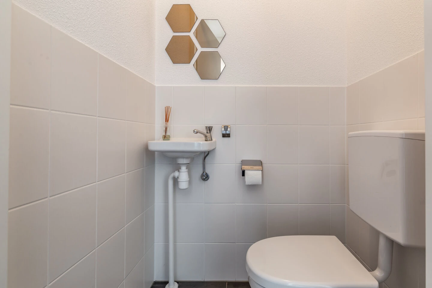 De badkamer is klein maar fijn en compleet. De ruimte is volledig betegeld met witte tegels aan de muur en grijze tegels op de vloer. Je treft hier een douchecabine, wastafelmeubel en toilet. Praktisch is het smalle raam dat voor extra daglicht en ventilatie zorgt.