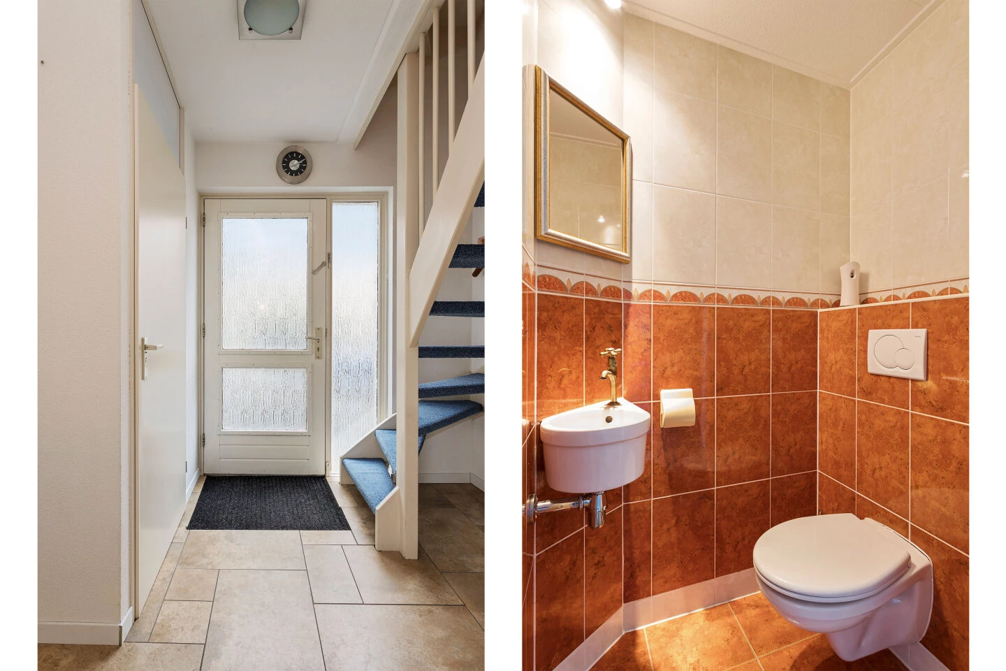 We betreden de woning via de ruime hal met de trap naar de verdiepingen. Hier vind je tevens het volledig betegeld toilet met fonteintje op de begane grond en de meterkast. Via de hal betreden we de woonkamer. Aan de voorzijde is een zitgedeelte gecreëerd met een sfeervolle inzethaard, en de woning is hier voorzien van een brede erker met inbouwspots. Op de vloer ligt mooie beige gemêleerde plavuizen en de wanden zijn gestukt. De keuken en woonkamer zijn voorzien van vloerverwarming en aan de achterzijde heb je toegang naar de tuin via de schuifpui.