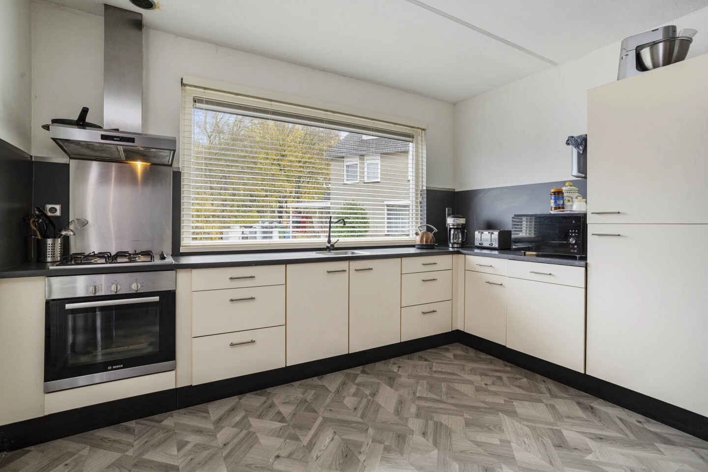 Aan de voorzijde bevindt zich de open woonkeuken, deze is heerlijk ruim. De lichte keuken heeft een L-opstelling. Je treft de nodige inbouwapparatuur, zoals een 4-pits gaskookplaat, oven, afzuigkap, koel/vriescombi en vaatwasser. Onder de trap is een voorraadkast/bergruimte. De gehele begane grond is voorzien lichte wanden en een laminaatvloer.