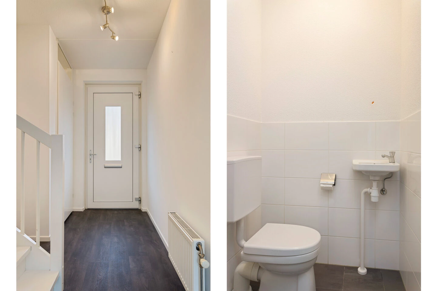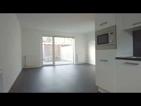 Lichte hal met trap, meterkast en half betegeld toilet met fonteintje. Dan komt je uit in de lichte open woonkamer met provisiekast, een groot raam met duo gordijn en deur die uitkijk geeft op de tuin. De lichte open keuken is voorzien van diverse inbouwapparatuur: gaskookplaat, afzuigkap, combimagnetron en vaatwasser. De gehele verdieping is voorzien van een donkere vinylvloer.
