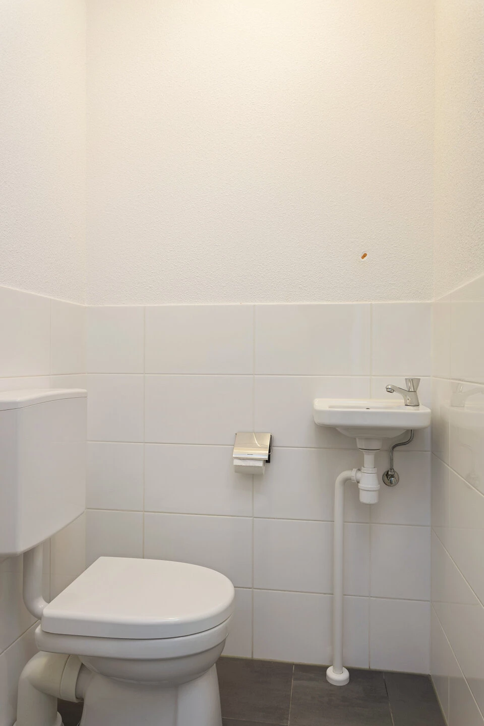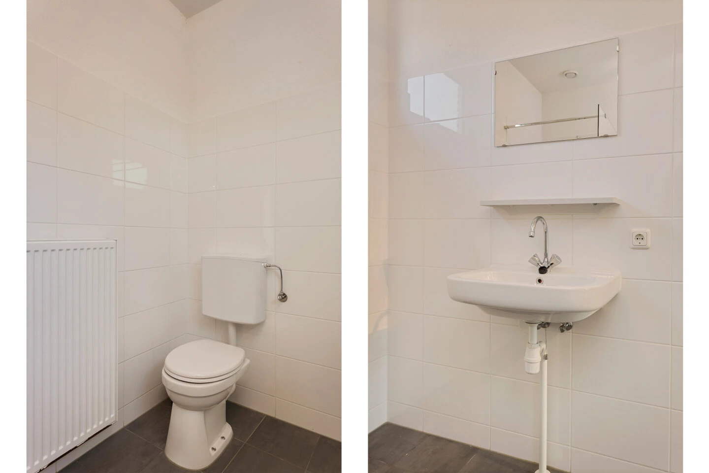 Deze is volledig betegeld en voorzien van een douche met glazenwand, wastafel, tweede toilet, radiator en raam voor natuurlijke ventilatie. De badkamer is voorzien van een beige tegelvloer. De gehele verdieping is voorzien van een donkere vinylvloer.