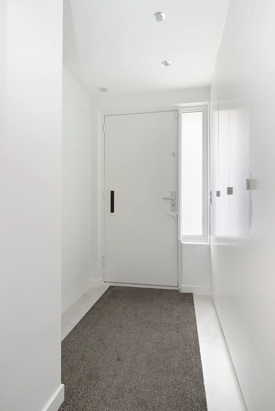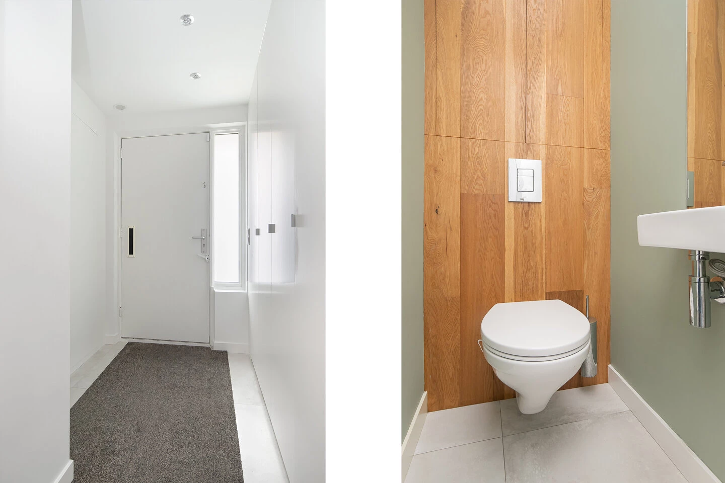 Je parkeert je auto veilig op eigen terrein aan de voorzijde en komt binnen via de lichte entreehal met spotjes met toegang tot de woonkamer en een modern, hangend toilet met houten planken, lichte tegelvloer en fonteintje.