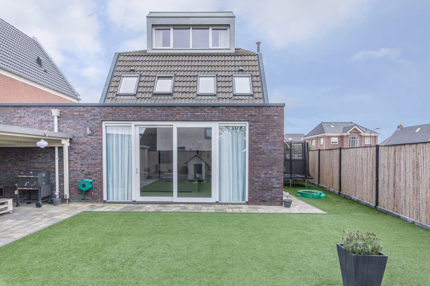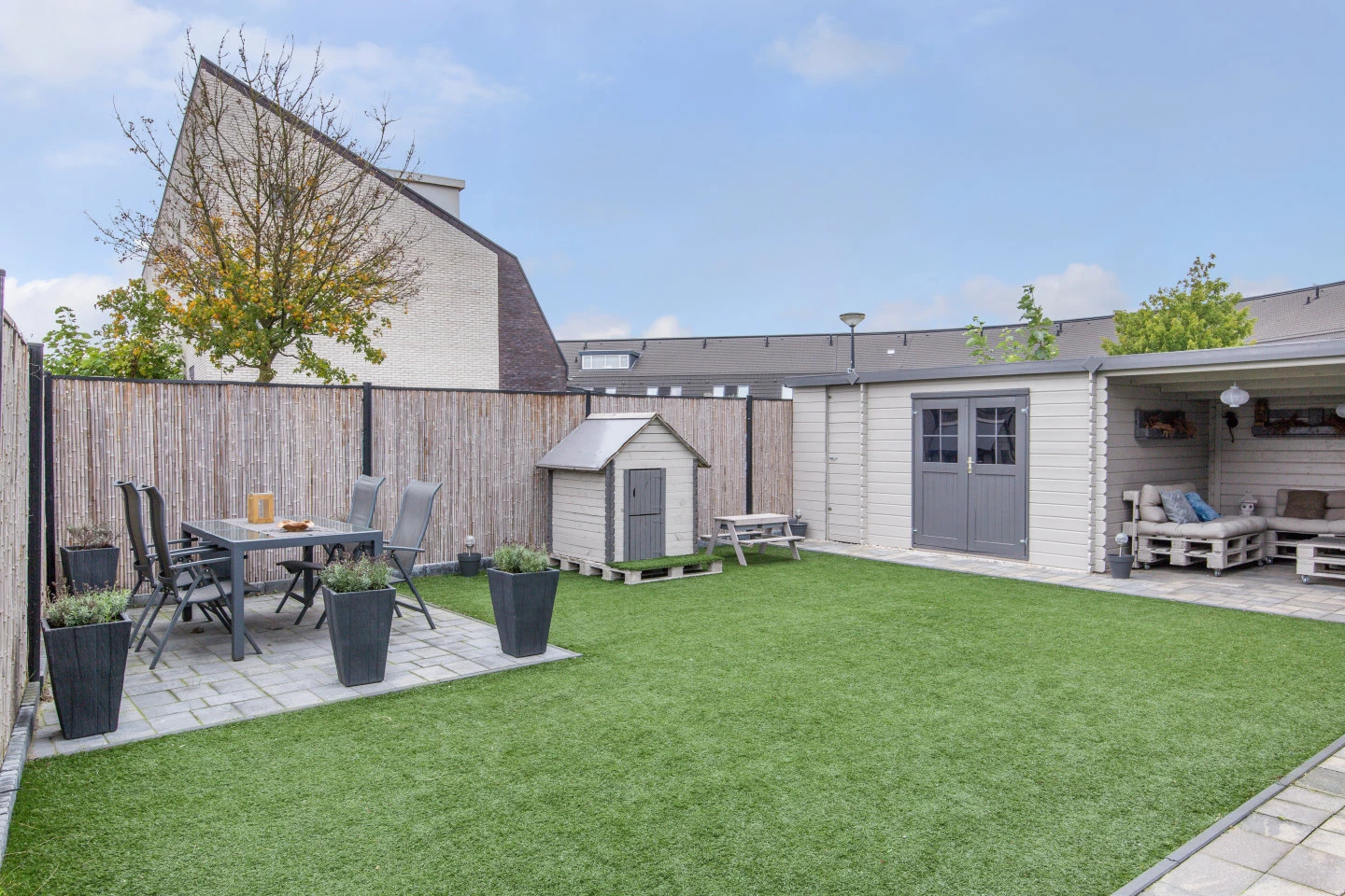 De goed onderhouden tuin is gelegen op het noordwesten en voorzien van een mooie overkapping met 2 aparte bergingen, handig om de tuinkussens en tuingereedschap in op te bergen. Tevens is er een overkapping voor de fietsen gerealiseerd.