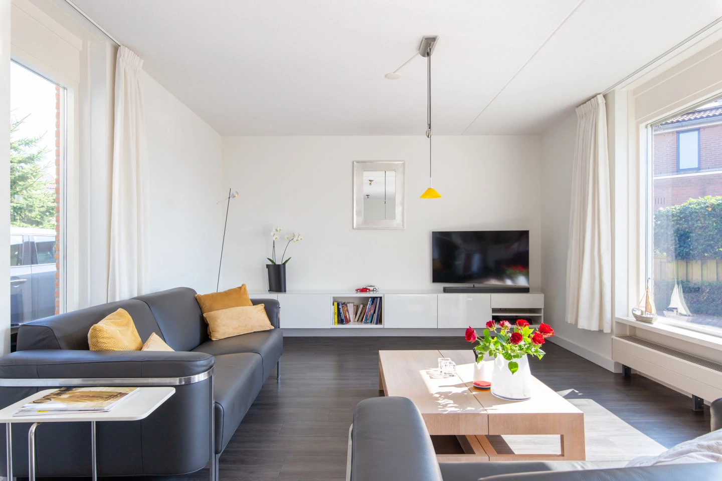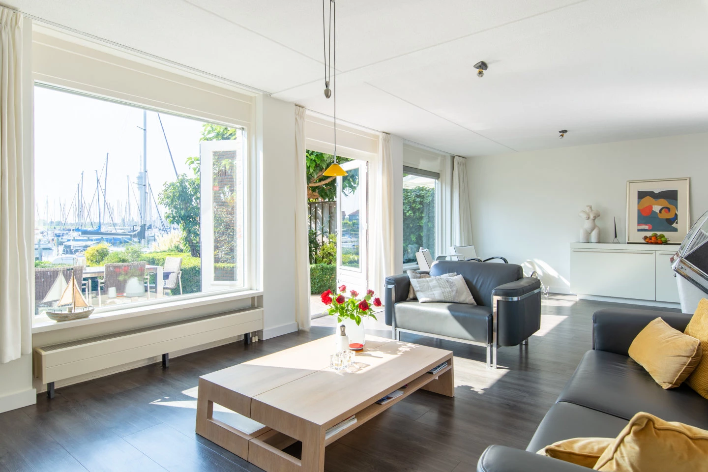 Aan de achterzijde treft u de tuingerichte woonkamer met grote ramen en dubbele openslaande deuren naar de achtertuin. Vanuit de woonkamer heeft u een fantastisch uitzicht over de haven.