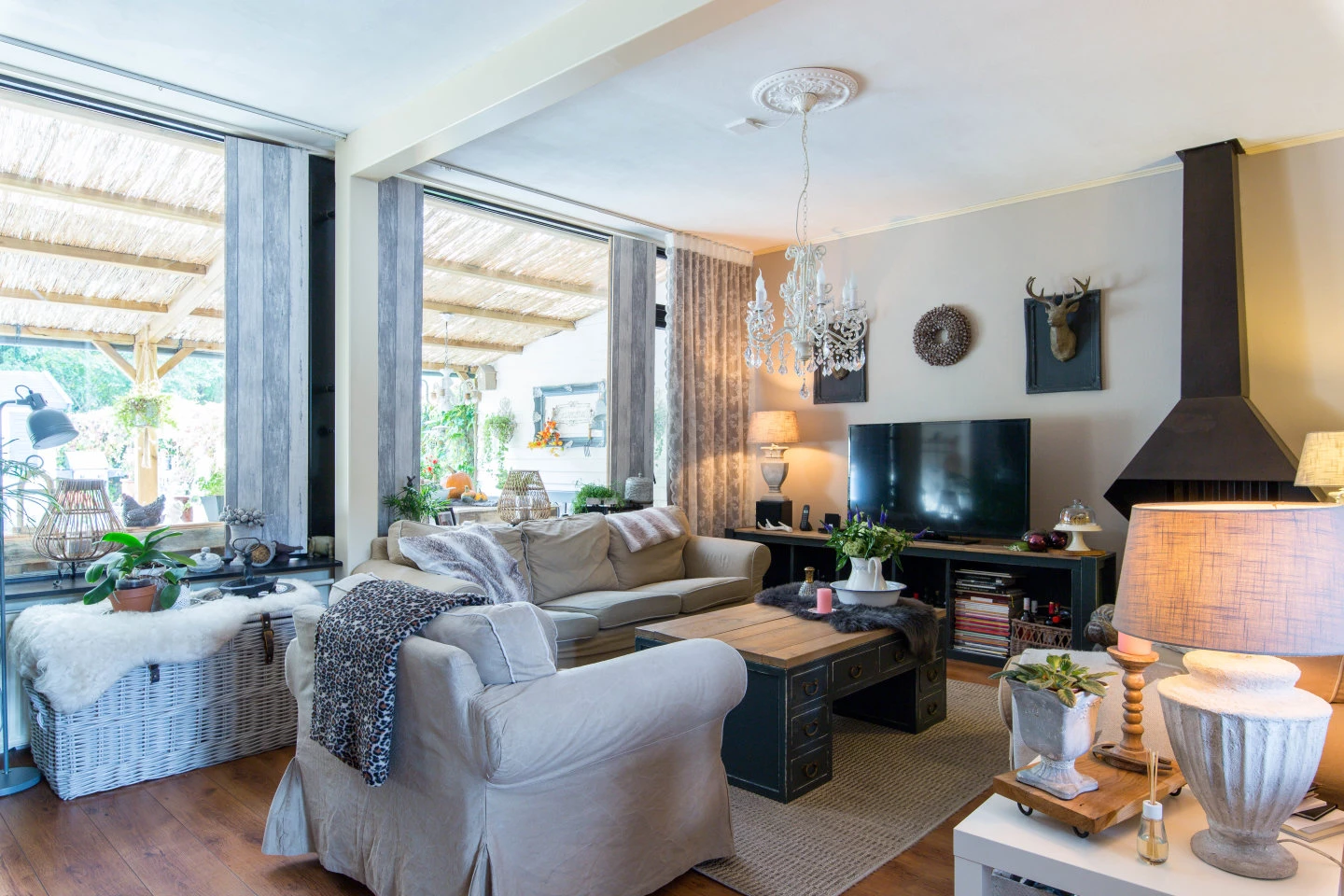 Entree, grote hal, meterkast, trapkast, jassenkast en basis toiletruimte met fonteintje. Tuingerichte woonkamer met laminaat vloer en deur naar de vrij gelegen zonnige tuin. Landelijke woonkeuken met ingebouwde oven, inductie kookplaat, afzuigkap, vaatwasser en inbouw koel/vries combi.