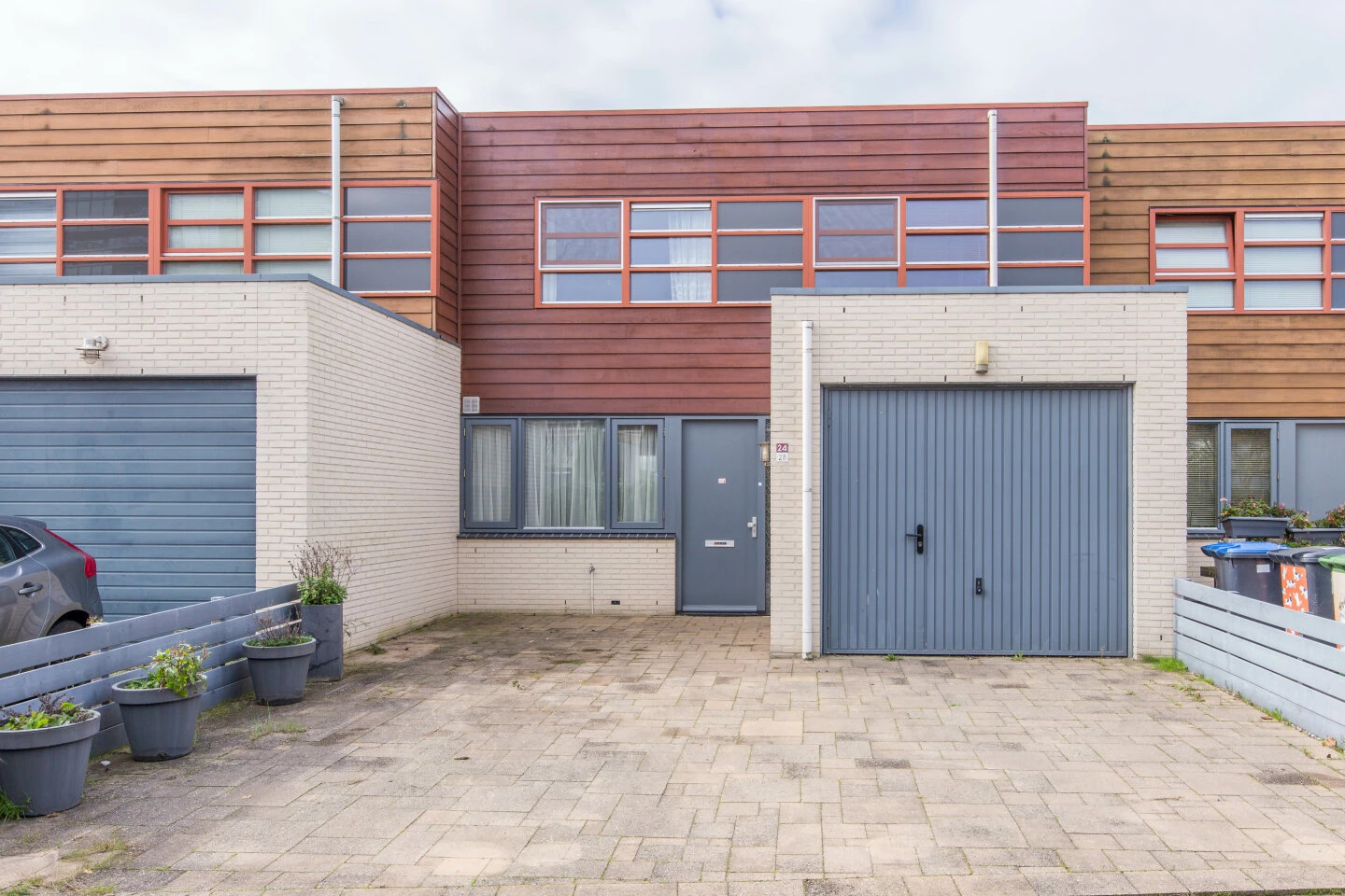 In de voortuin de aangebouwde garage voorzien van elektra. Hier kunt u met gemak uw auto fietsen stallen. Op eigen terrein kunt u met gemak 2 auto's kwijt. De voortuin is, net als de achtertuin, onderhoudsvriendelijk aangelegd.