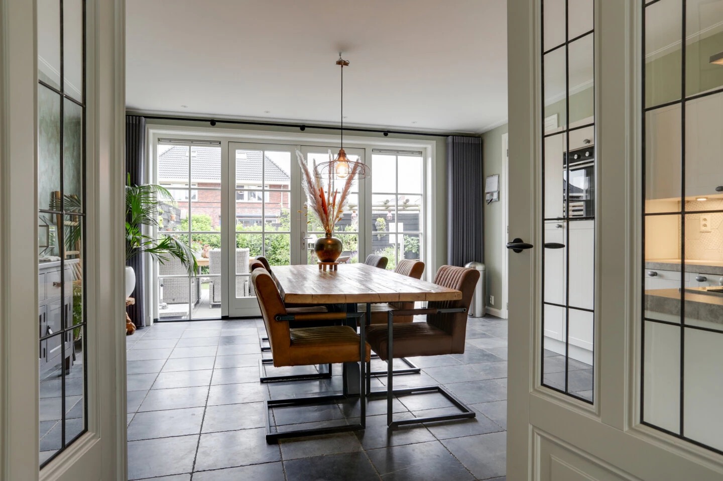 Via het oprijpad komt u bij de voordeur. U binnen via in de hal met meterkast, garderobe en toegang tot een keurig toilet met fonteintje. De stijlvolle woonkamer bevindt zich aan de voorzijde van de woning. Een knusse ruimte met een bio ethanol haard en groot raam uitkijkend over de straat. Via de en suite deuren met glas in lood ramen krijgt u toegang tot de woonkeuken. Een grote ruimte om waar u heerlijk kunt zitten met familie en vrienden. De keuken staat opgesteld in een hoek en is voorzien van inbouwapparatuur zoals een 5-pits gasfornuis met rvs-afzuigkap, vaatwasser, koelkast, vriezer, oven en Quooker. Een tweetal opslaande deuren geeft u toegang tot de achtertuin. Vanuit de keuken komt u in de aangebouwde garage welk is opgesplitst in bijkeuken en schuur. In de bijkeuken is een uitstortgootsteen aanwezig, klein keukentje en garderobe. De schuur is in 2020 geïsoleerd en is een prima opbergplek voor de fietsen, tuingereedschap enz. Er is vloerverwarming aanwezig in de woonkamer, keuken en de hal.